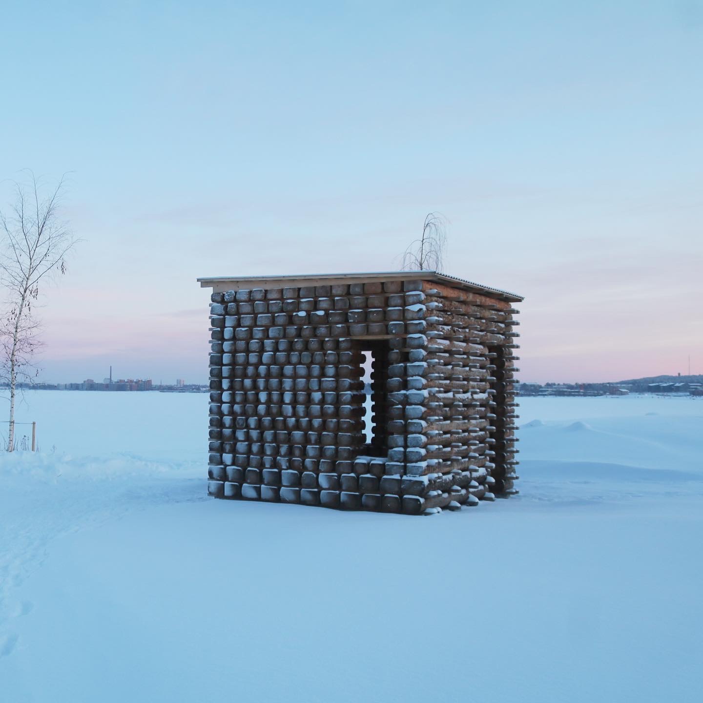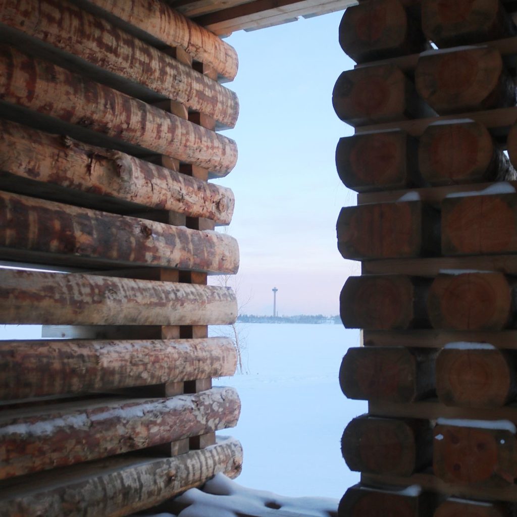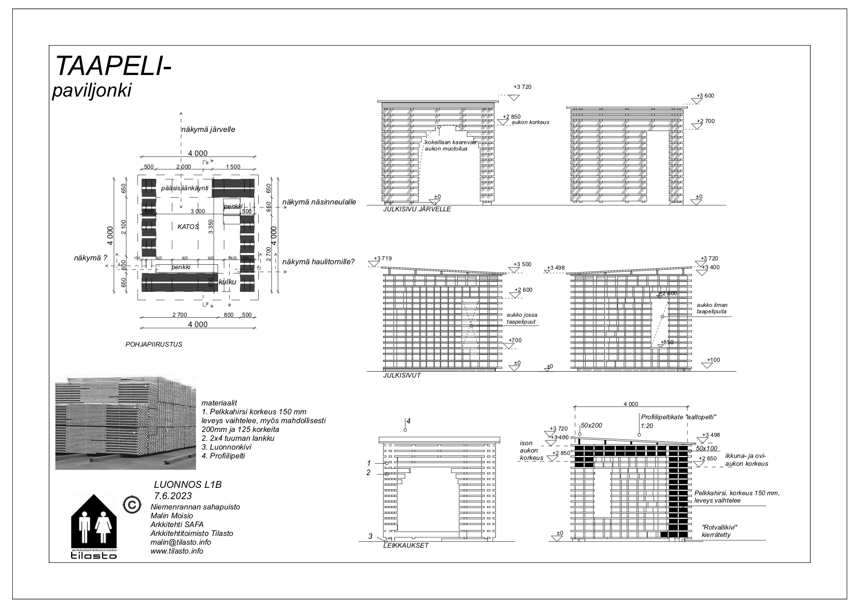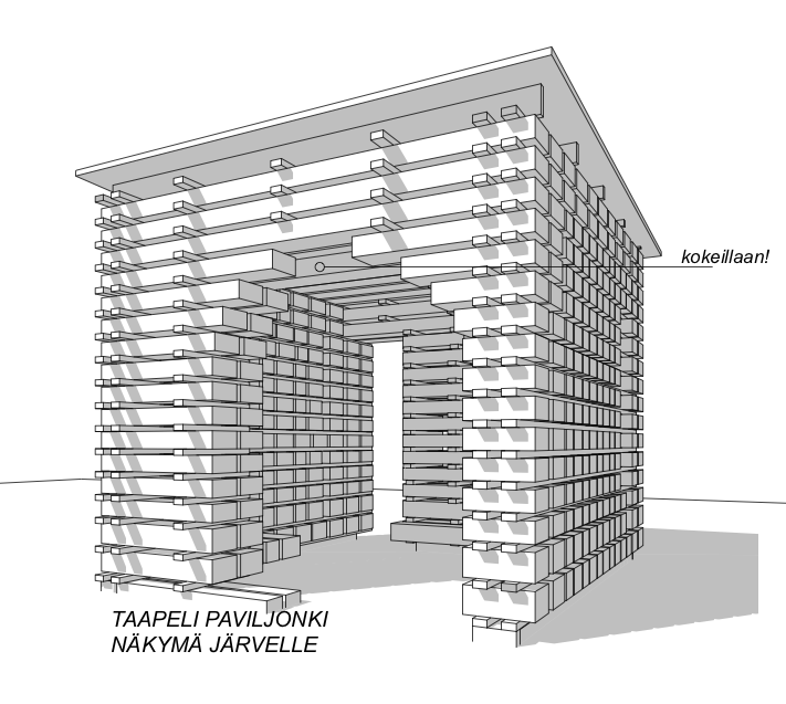 4m x 4m x 4m Taapelipaviljonki on tehty taapeliin ladotusta pelkkahirrestä jossa välipuina toimii 2×4 tuuman lankut. Perustusten luonnonkivet ja kattopelti on kierrätysmateriaaleista. Paviljongissa on penkit ja aukoista voi ihastella Näsijärven maisemia sekä tamperelaisia maamerkkejä kuten Haulitornia ja Näsinneulaa.